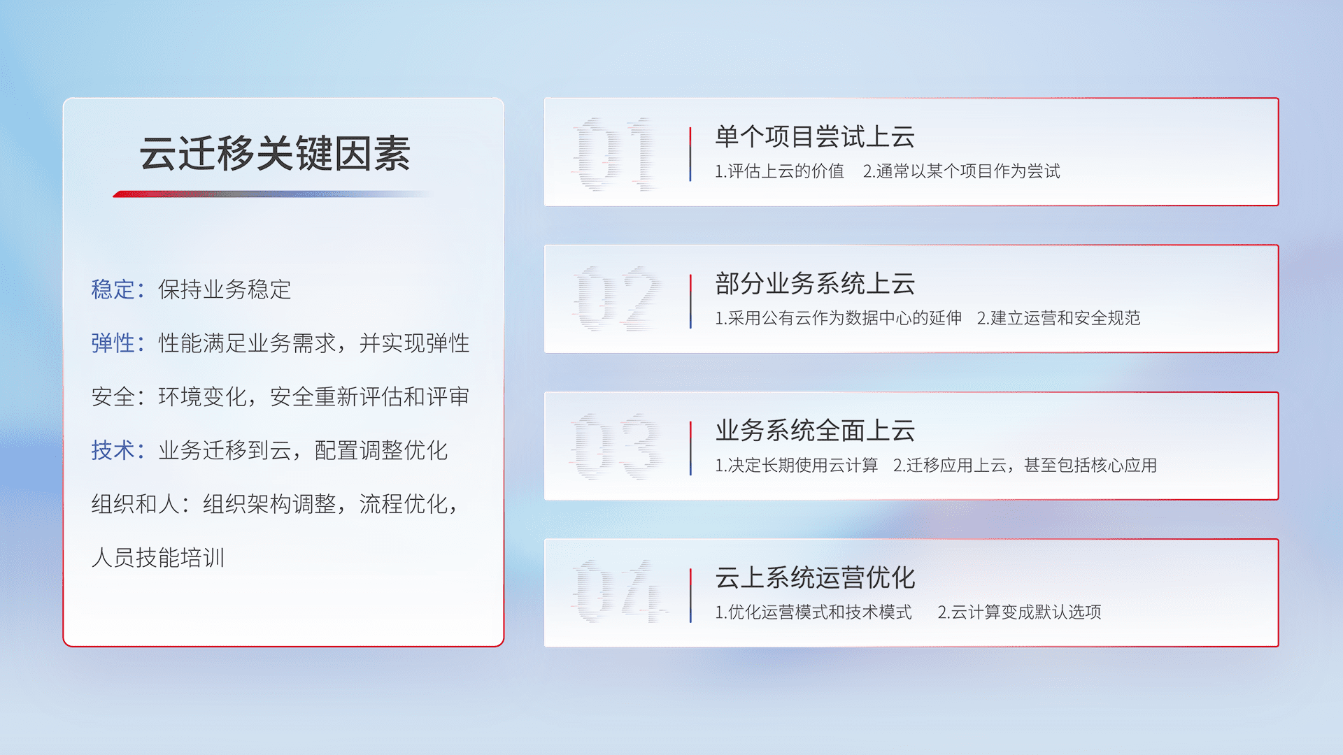 结合实际业务,,,从规划设计、、、、云平台选型、、、、云原生改造、、数据迁移、、、集成交付,,,,迁移全过程为客户识别最佳上云路径,,,,做好风险识别管理,,设计网络架构、、身份权限、、、、安全审计合规、、操作审计、、、日志审计、、监控告警策略、、、、多站点容灾设计等,,对云上基础设施进行整体规划,,提升IT治理水平,,以满足弹性、、、高可用、、高性能的需求。。。